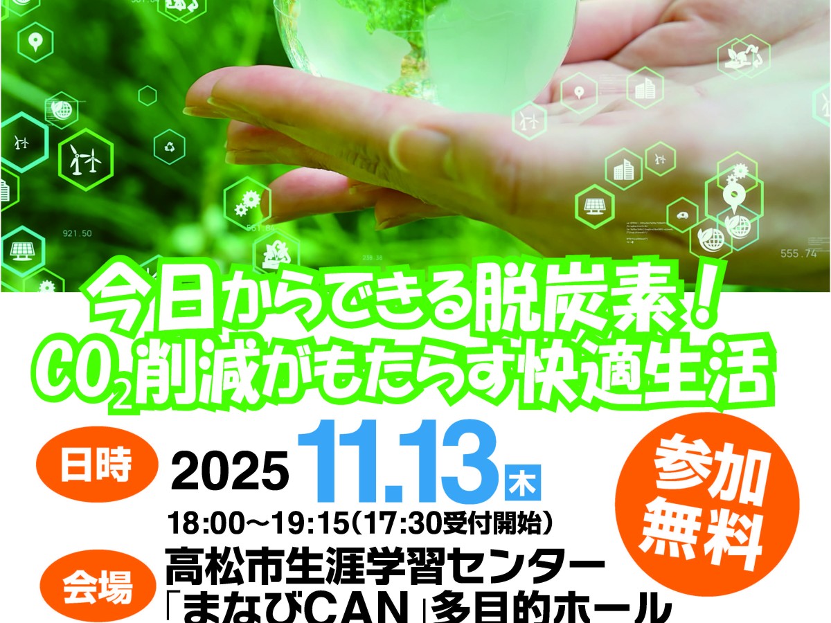 11月13日(木)18:00~19:15(17:30~受付)に高松市生涯学習センター「まなびCAN」多目的ホールにて、 2025年度11月例会事業を開催いたします! 「今日からできる脱炭素!CO₂削減がもたらす快適生活」と題しまして、 各ご家庭で手軽にすぐにでもできる脱炭素の取り組み方の紹介や、 その取り組...
